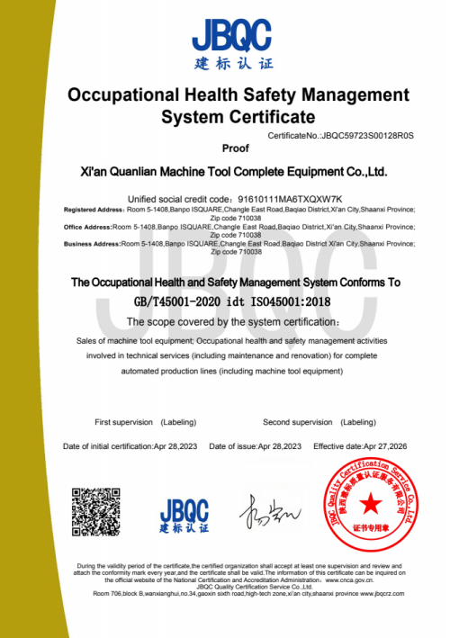 全聯成(cheng)套全面通(tōng)過職業健(jiàn)康安全管(guan)理體系認(ren)證證書